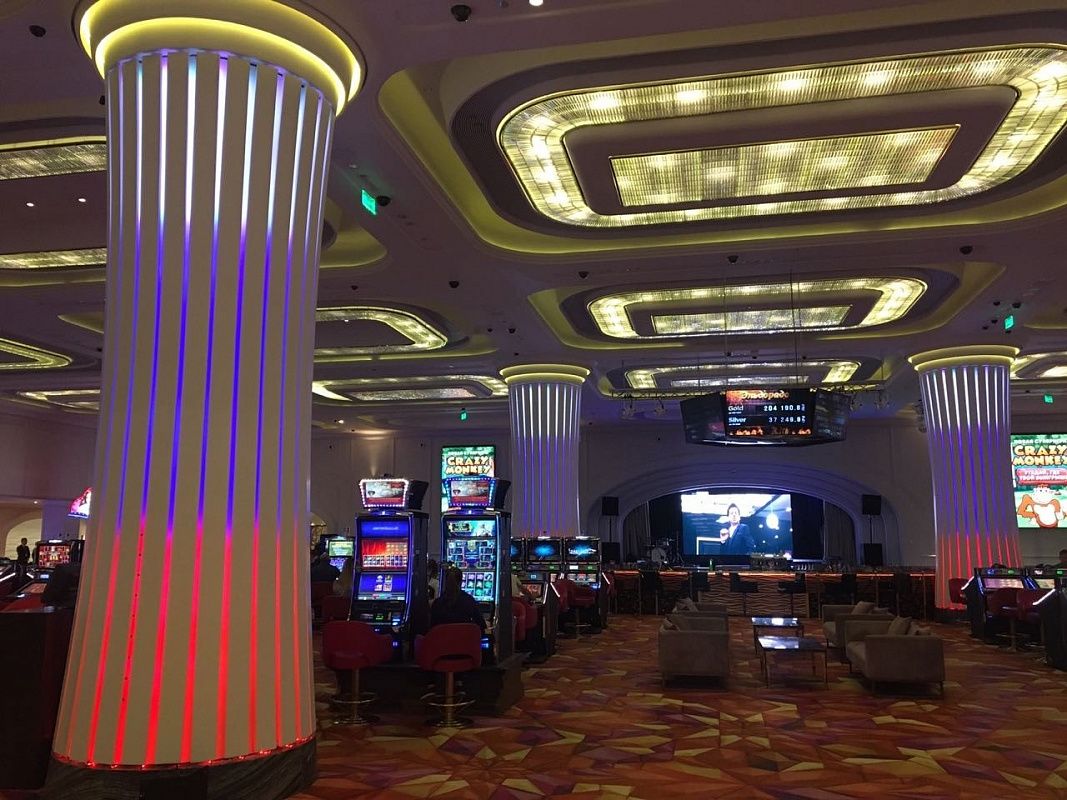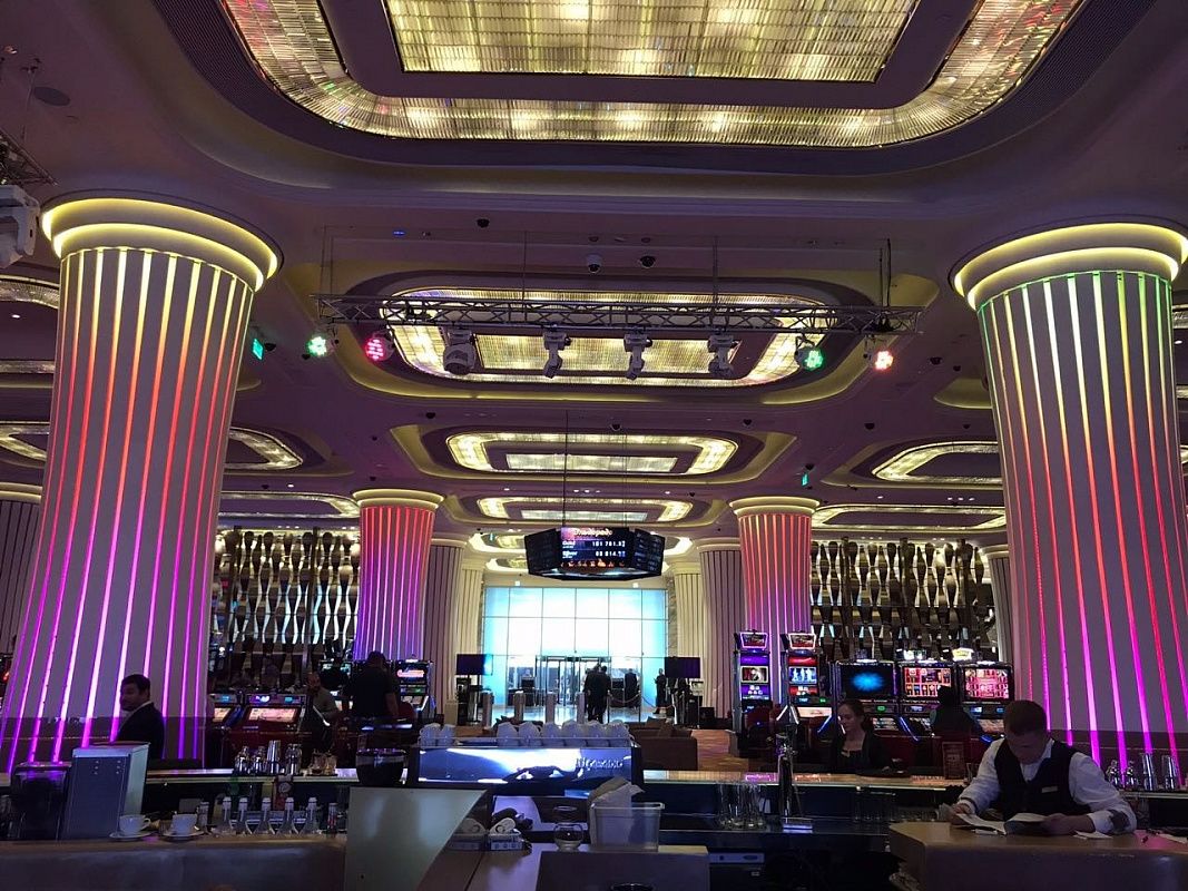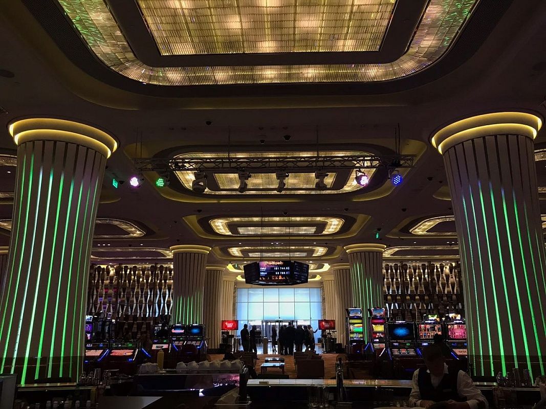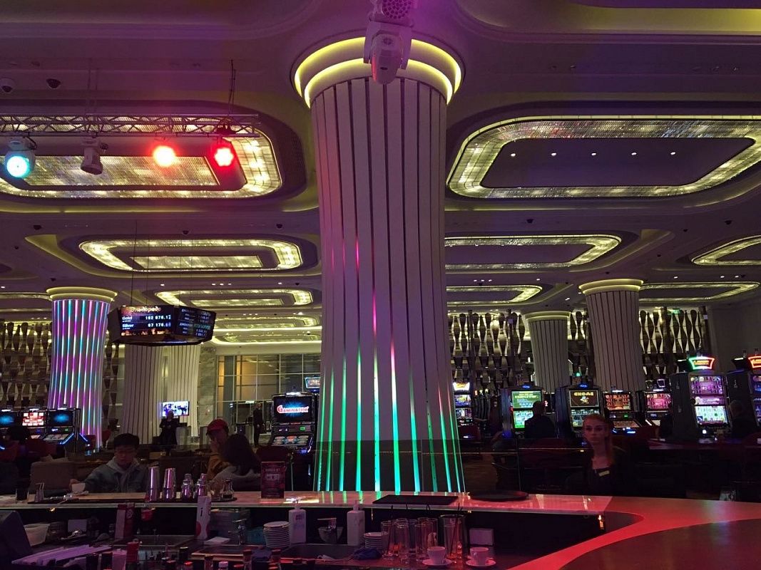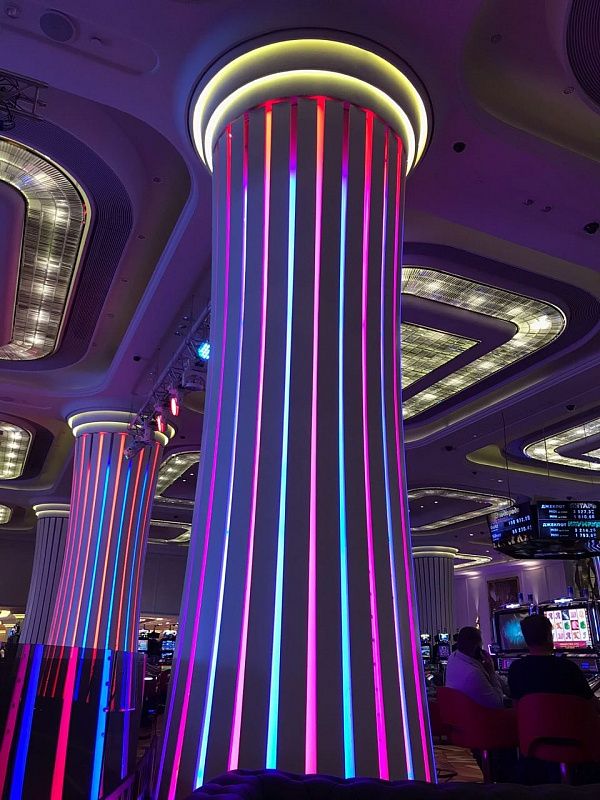 Оборудование DMX торговой марки Санэлек управляет подсветкой интерактивных колонн казино.